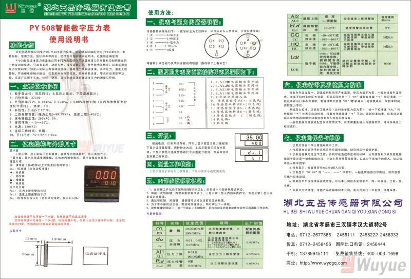 歡迎您選用湖北五岳傳感器有限公司生產(chǎn)的PY508/PY1508智能數(shù)字壓力儀表。該說明書詳細(xì)的介紹了PY508/PY1508的性能特點,參數(shù)指標(biāo),使用方法,維護保養(yǎng)等內(nèi)容。使用前仔細(xì)閱讀本說明書,以便您正確使用。
