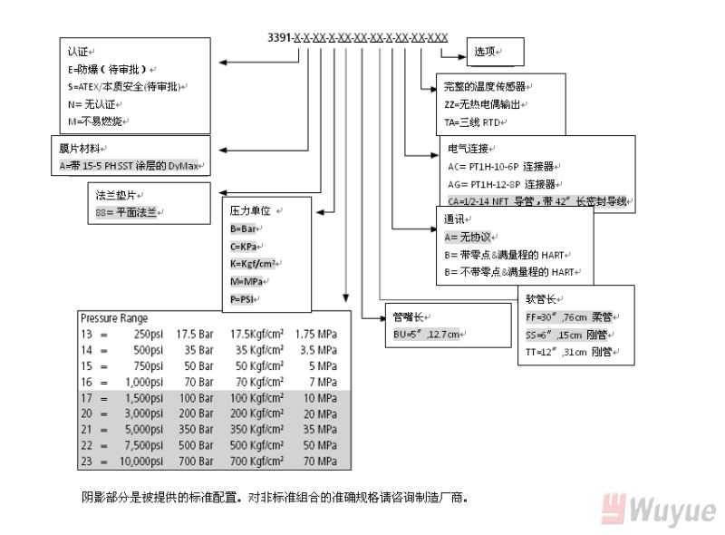 輸出,模擬:4-20mA(標準壓力,溫度可選) 輸出,數(shù)字:HART 綜合精度(錯誤)(20-100%滿量程): ±0.15%滿量程(3M和3M以上) +0.25%滿量程(1.5M和1.5以下) 溫度漂移(77-572℉,25-300℃):0.001%滿量程/℉,最大(0.001%滿量程/℃,最大) 重復(fù)性:±0.1%滿量程 爆破額定壓力:2X滿量程 超壓 額定:1.5X滿量程 量程:1,500至10,000psi 可調(diào)范圍:6:1調(diào)節(jié)比,向下 負載電阻:250歐姆@18Vdc;500歐姆@23Vdc |