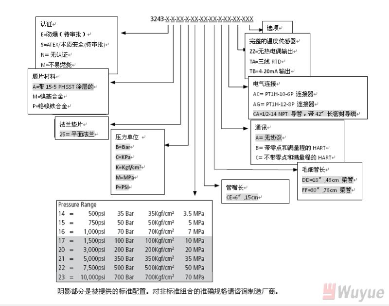 輸出,模擬:4-20mA(標(biāo)準(zhǔn)壓力,溫度可選) 輸出,數(shù)字:HART 綜合精度(錯(cuò)誤)(20-100%滿量程): ±0.25%滿量程(3M和3M以上) +0.35%滿量程(1.5M和1.5以下) 溫度漂移(77-572℉,25-300℃):0.001%滿量程/℉,最大(0.001%滿量程/℃,最大) 重復(fù)性:±0.1%滿量程 爆破額定壓力:2X滿量程 超壓額定:1.5X滿量程 量程:1,500至10,000psi 可調(diào)范圍:6:1調(diào)節(jié)比,向下 負(fù)載電阻:250歐姆@18Vdc;500歐姆@23Vdc |
